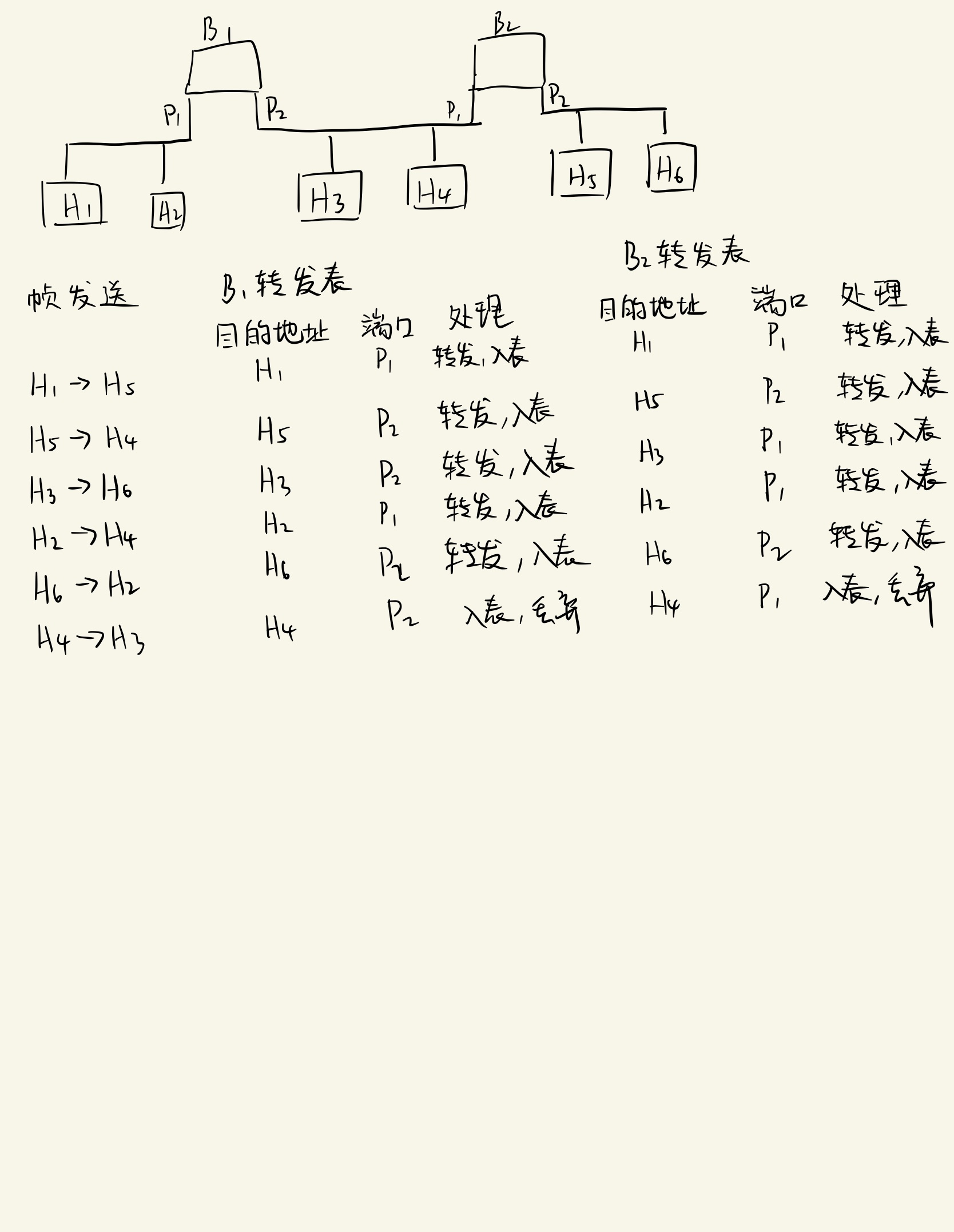 H6主机发出帧,同一网段下H5主机和网桥B2的端口P2可接收到此帧。网桥B2收到帧后查表,查到目的地址H2的端口为P1,因为和接收到此帧的端口P2不一致,可知H2不在同一网段下,那么就将此帧转发。网桥B1通过端口P2接收到此帧,查表,目的地址H2的端口为P1。与接收到此帧的端口P2不一致,可知所处网段不同,所以还是得将此帧进行转发。