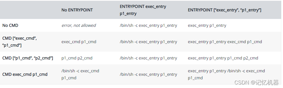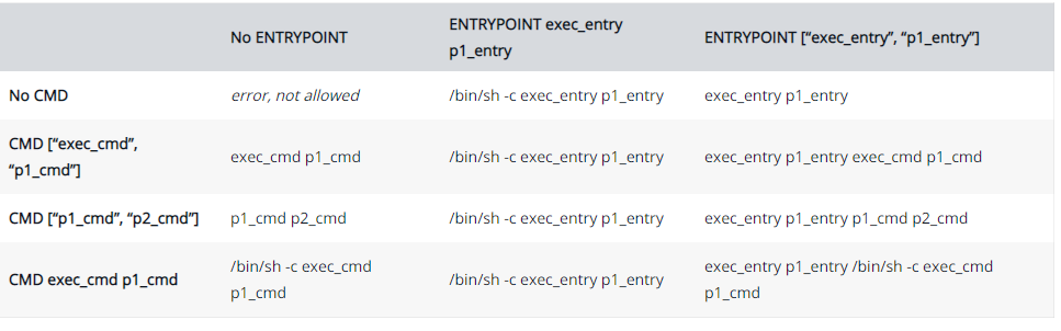下面的表格显示不同CMD和ENTRYPOINT组合后最终执行的命令