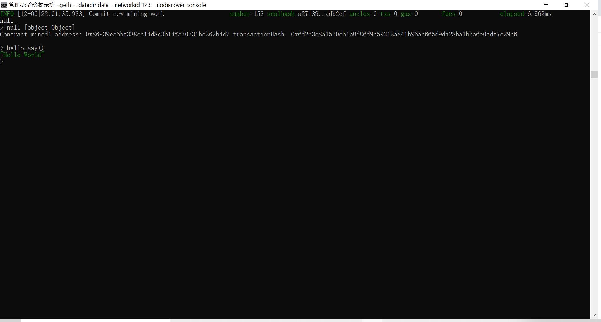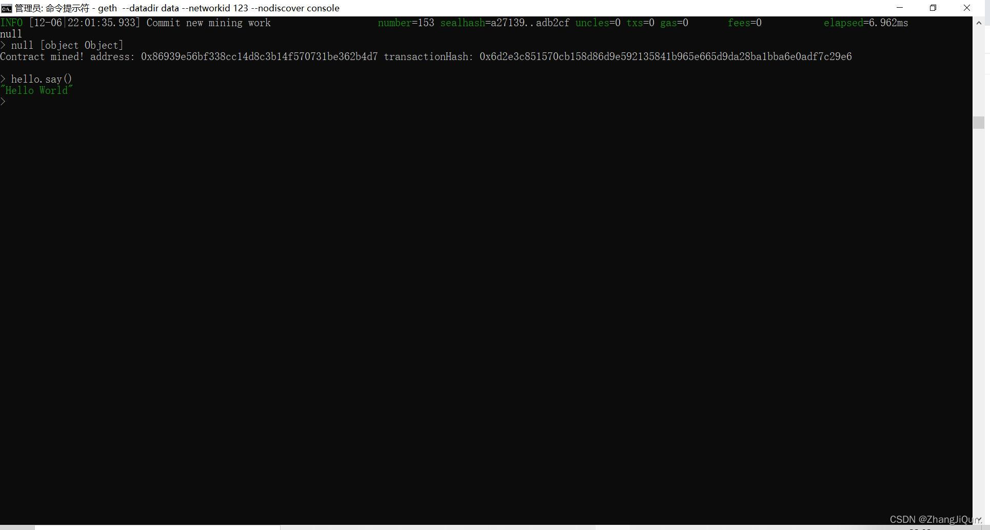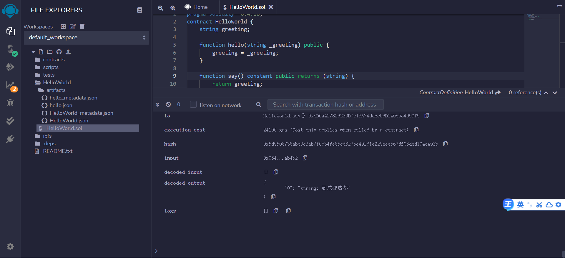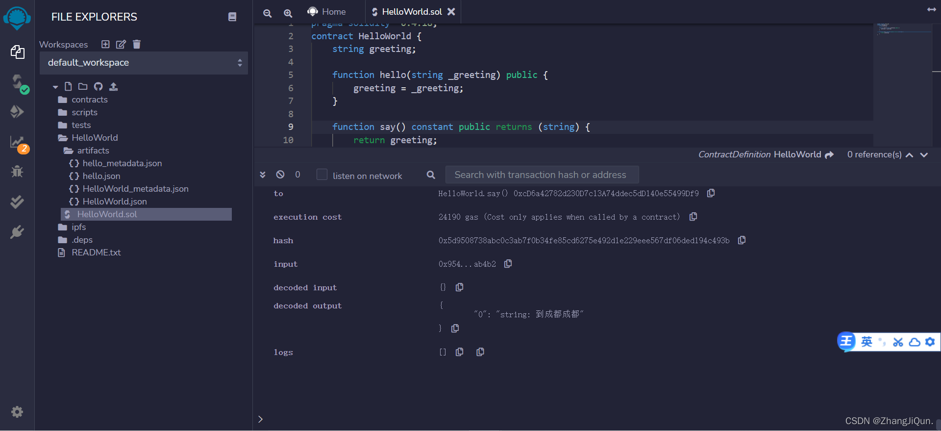 输出Hello World,我们第一个合约Hello World,成功运行了。