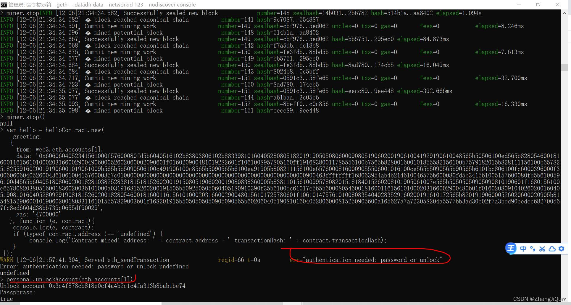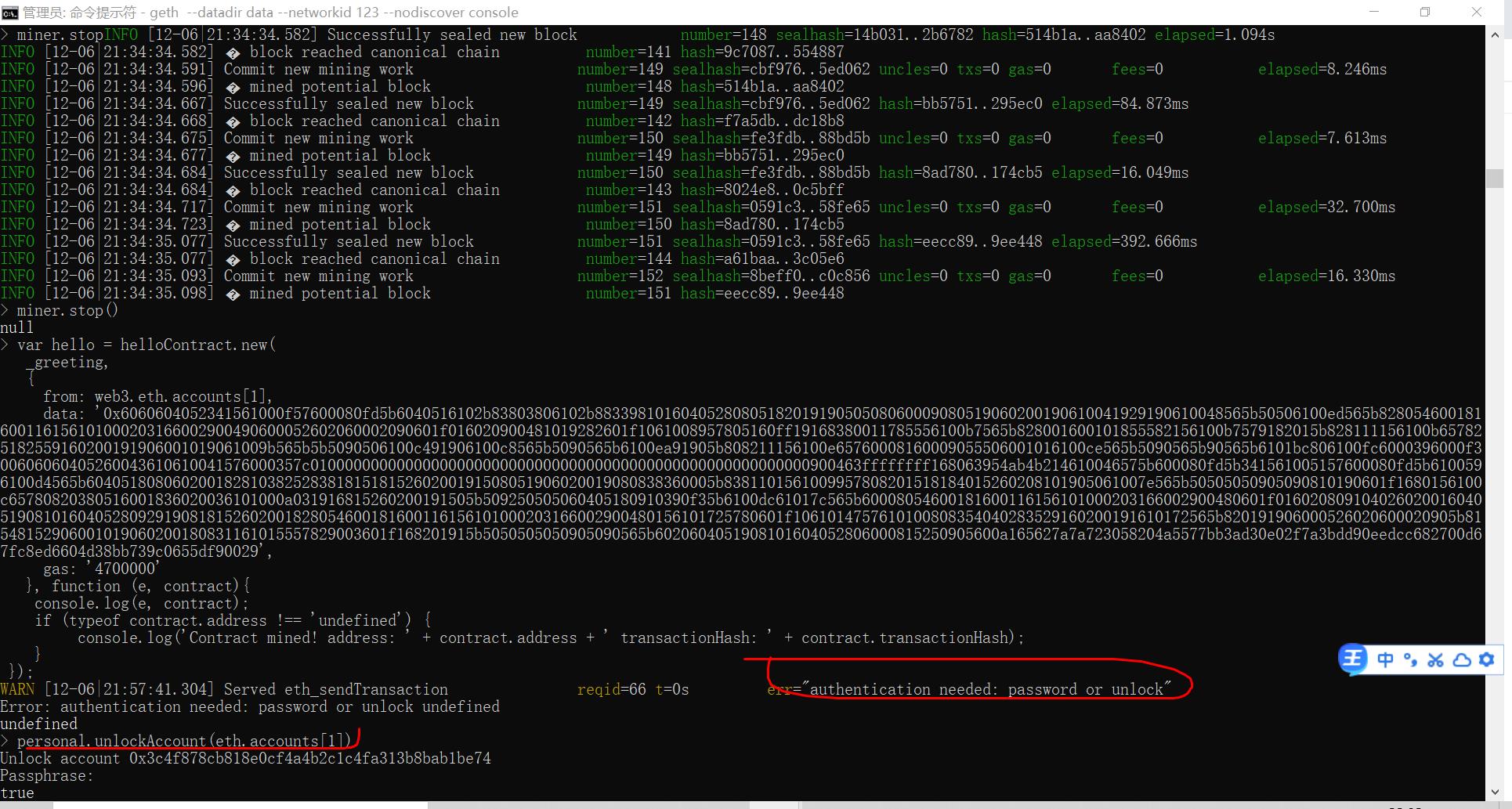 在部署合约前需要先解锁账户(就像银行转账要输入密码一样),使用以下命令: