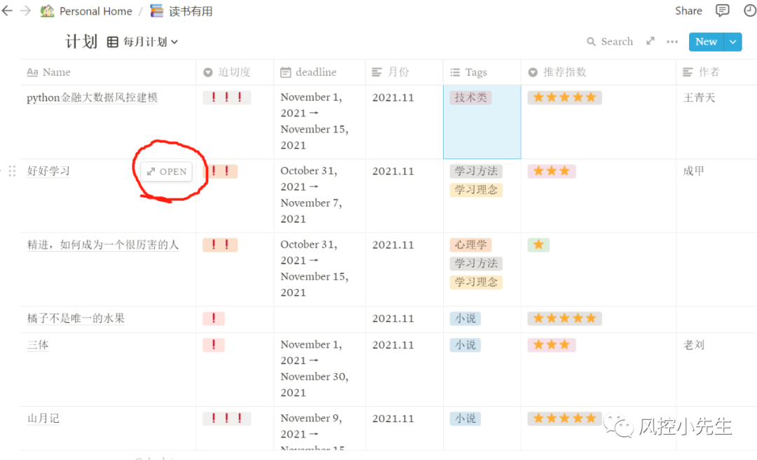 然后,对于读书计划,我展示了一下11月份的部分书单。可以看见书单的表格可以建立:标签、推荐指数、作者、迫切度等一系列的你想要记录的东西。在以前,我看小说从来不记录,纯属娱乐。一方面是因为以前只看武侠小说和推理小说,最喜欢的系列包括金庸、古龙、梁羽生、温瑞安等,推理小说包括阿婆、奎因、宫部美雪等。现在想想看这些玩意儿属实浪费了大量的学习时间。现在,看书也学会记录了,不为别的,只为日后可以再打开快速温习一遍,我们看过的很多书,没有笔记的话,我们会遗忘书籍中百分之九十九的内容。