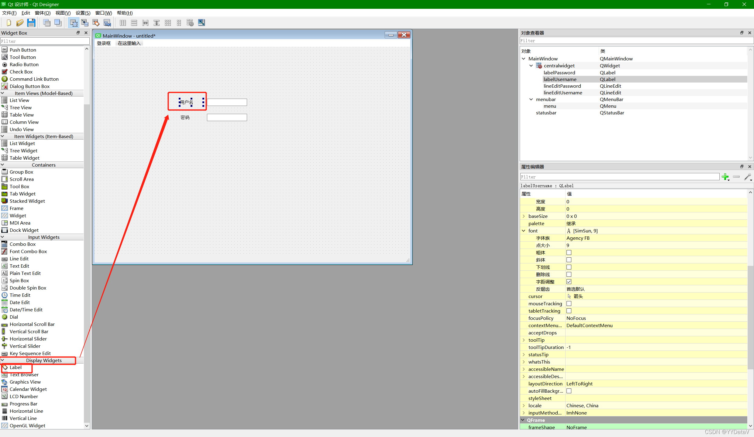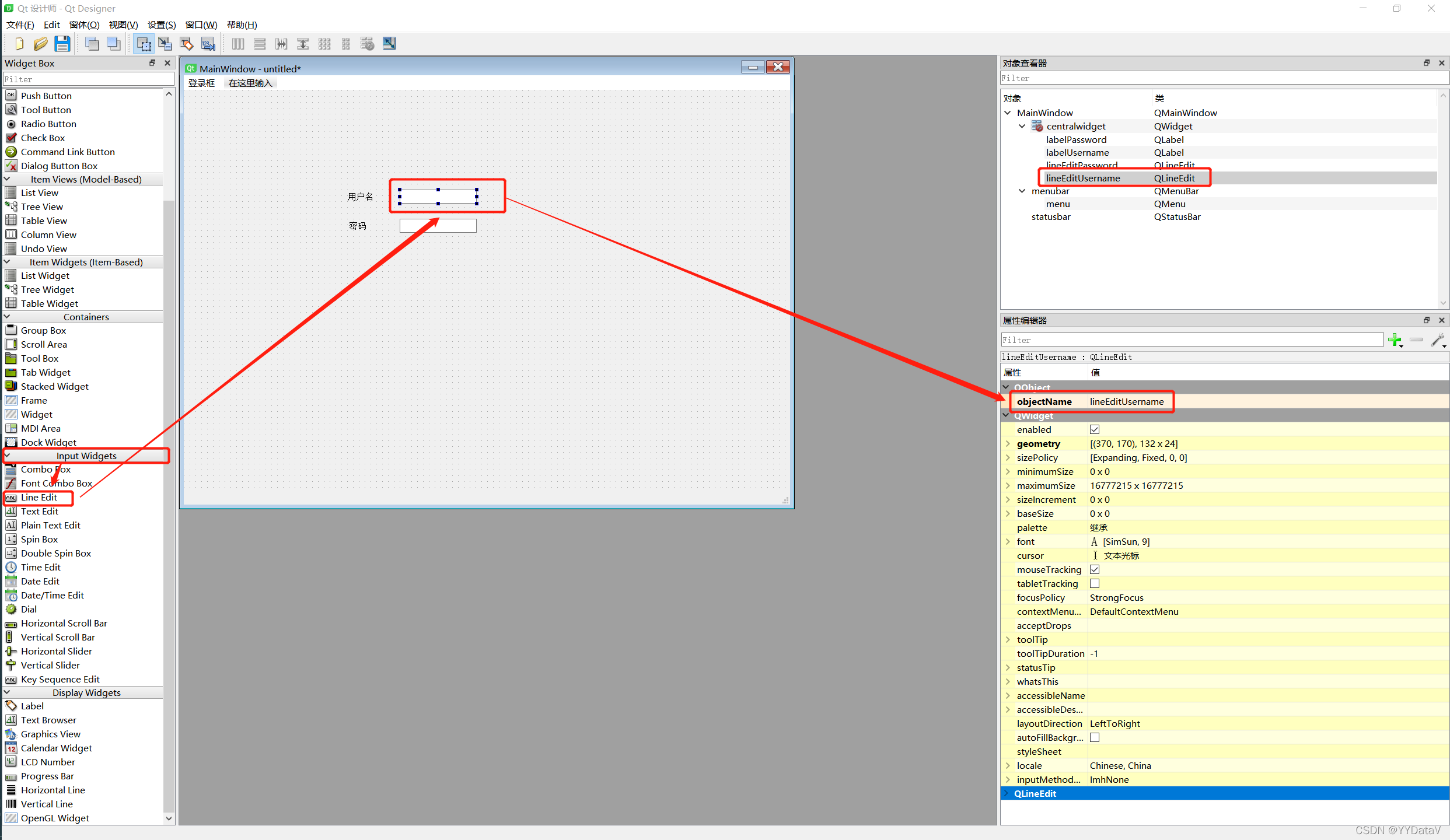 用户输入的用户名和密码均属于 Input Widgets 之 Line Edit 输入框 单行输入框。并在右侧 QObject之Object Name属性修改该对象的唯一名称属性。