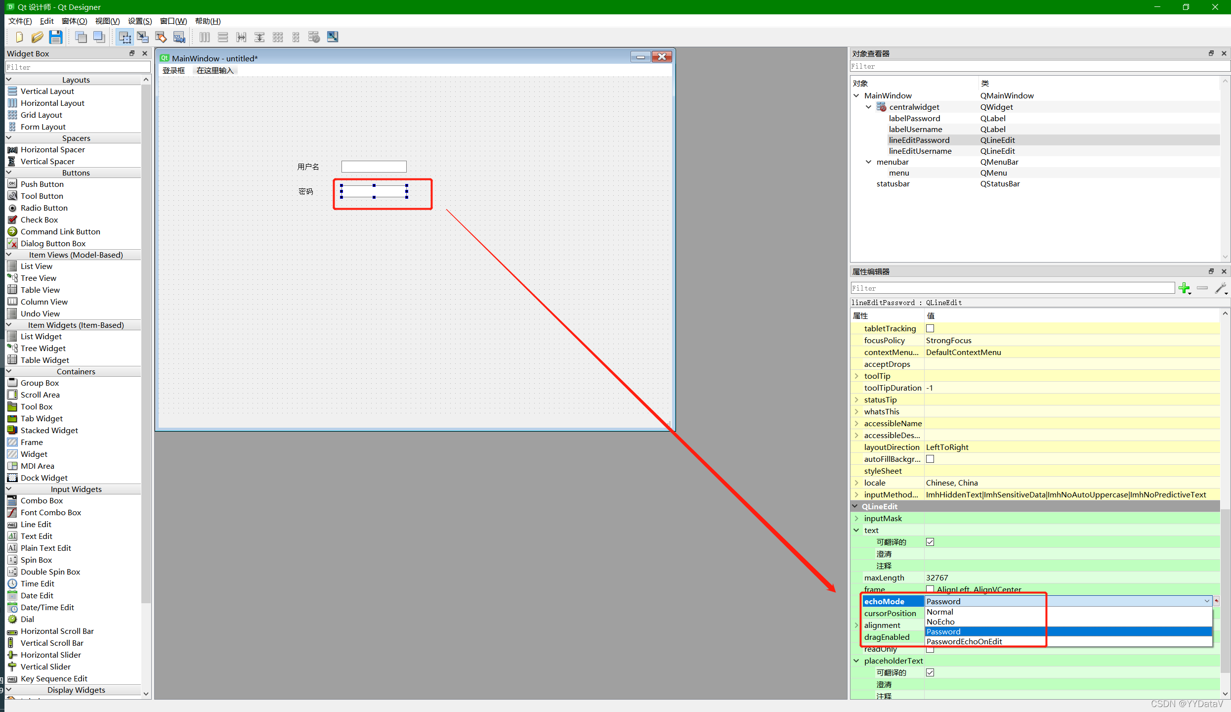 其中,密码需要隐藏显示,所以需要设置 QLineEdit 的 echoMode属性为 Password,该属性默认为 normal。