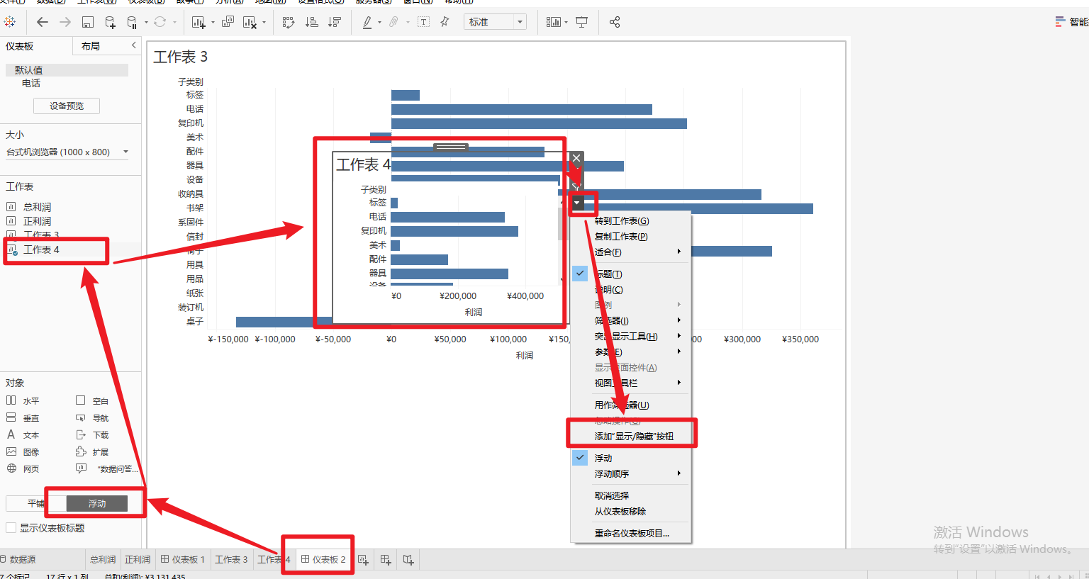 3.接下来,建一个仪表盘,把工作表3平铺放好,然后点击浮动,把工作表4拖到正中央,选择下拉箭头,单击“添加显示/隐藏按钮”