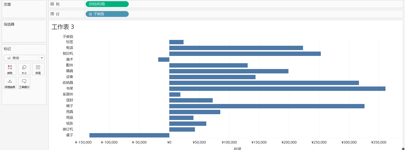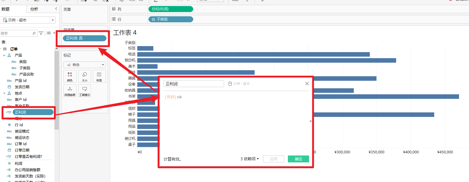 2.再建一个工作表,创建一个计算字段【正利润】:利润>0,拖到筛选器上选择“真”,这样就只能显示正利润的数值啦
