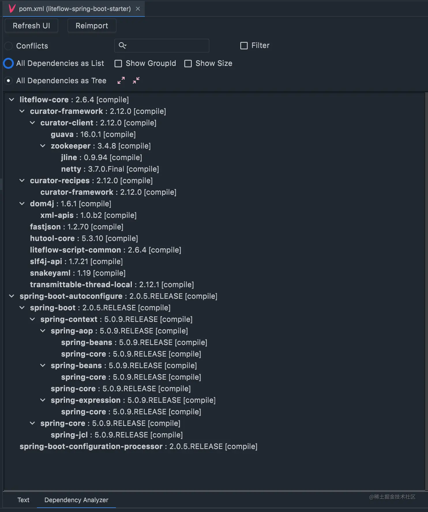 我经常使用到的功能便是可视化依赖书,可以清晰的知道,哪个Jar包传递依赖了什么,哪个jar包什么版本和什么版本冲突了。