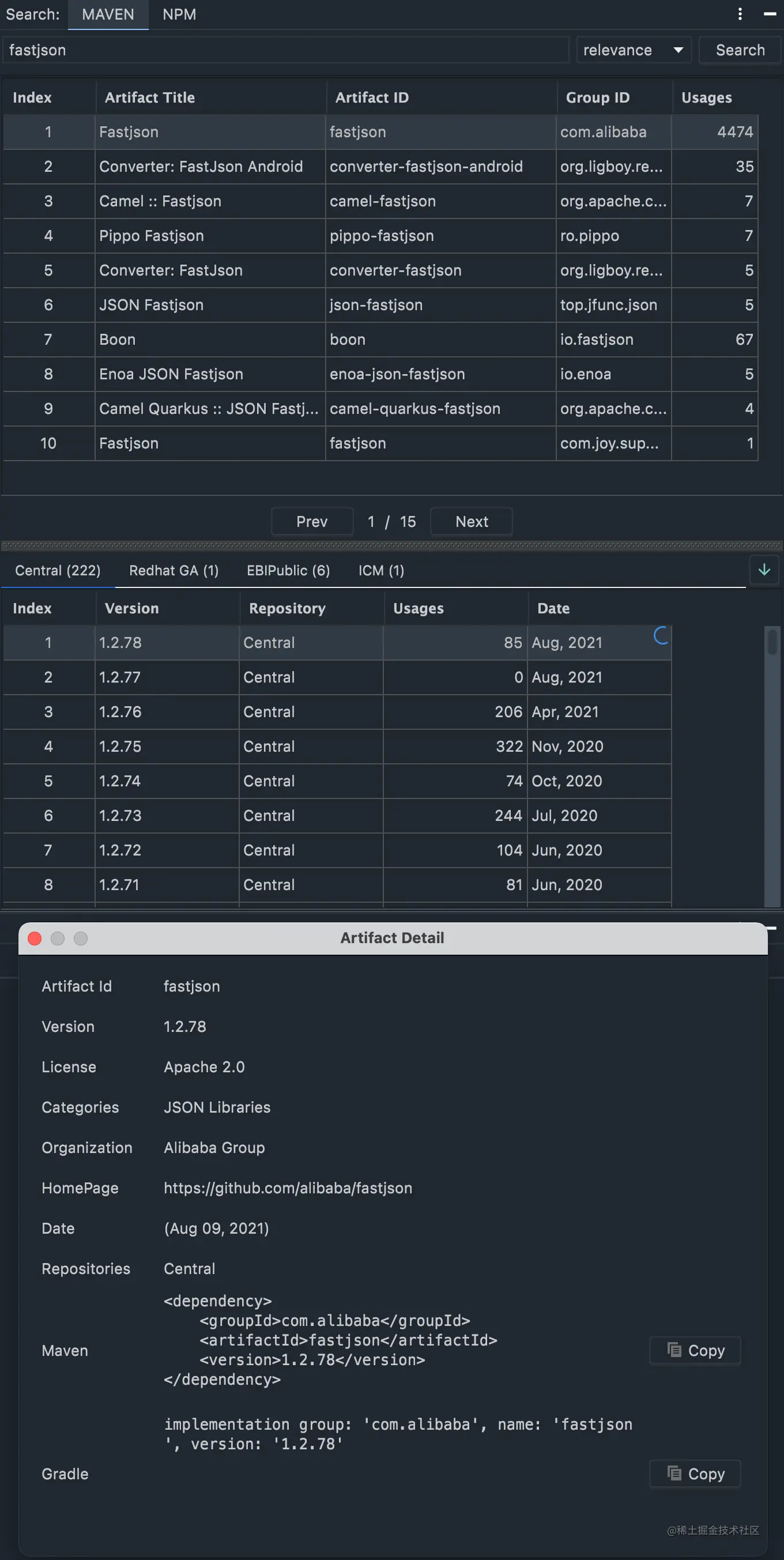 这款插件,就无需你来回跳转,直接把中央仓库的查找集成到了Idea里面。你只需要打开这款插件,输入jar包的名字或者gav关键字,就能查到到这个jar包所有的版本,然后可以直接复制gav坐标。方便又快捷,干净又卫生!