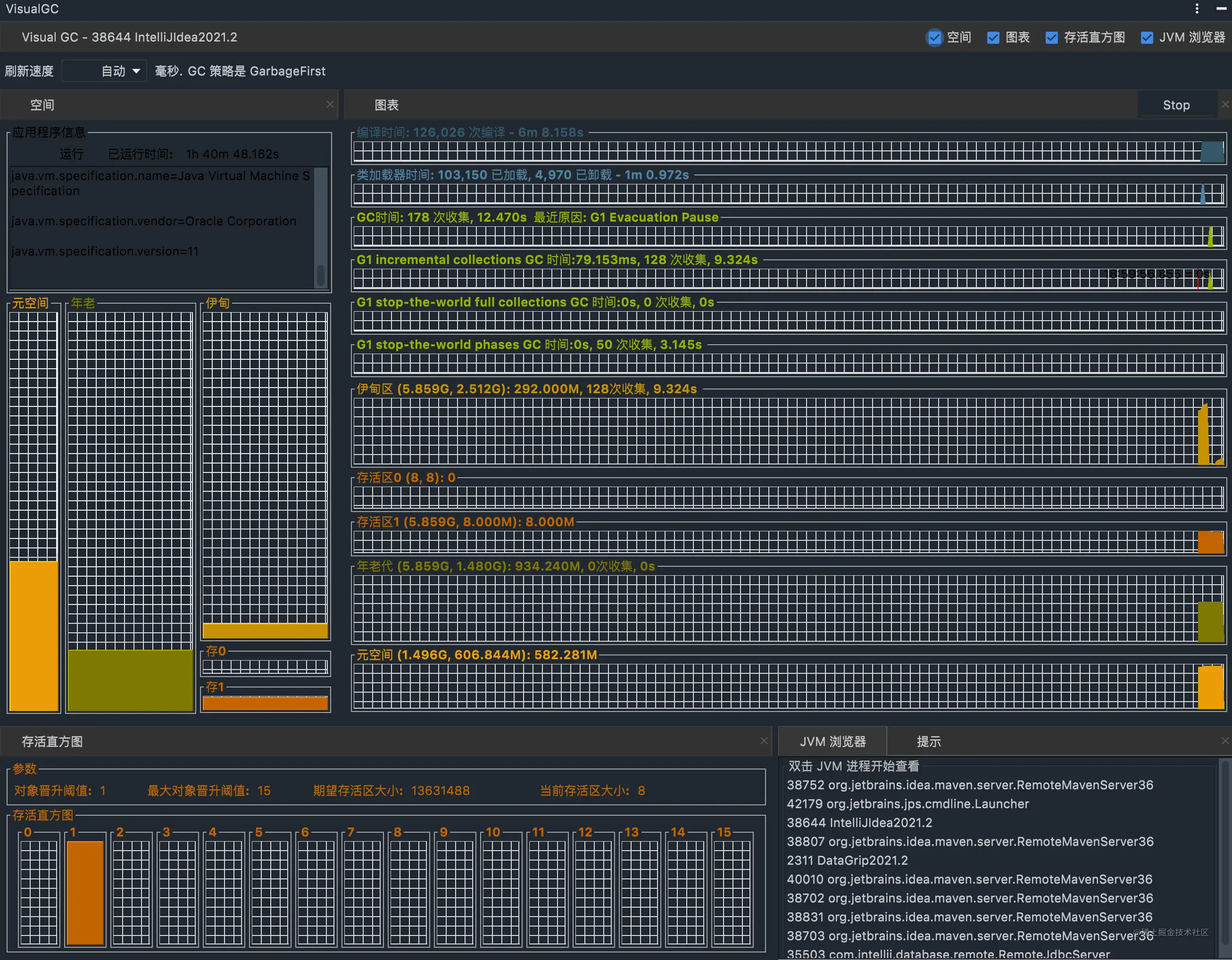 这里推荐大家一个Idea堆栈的可视化工具,和Idea深度集成。直接显示所有进程,双击即可打开JVM的堆栈可视化界面。堆栈和垃圾收集情况一目了然!