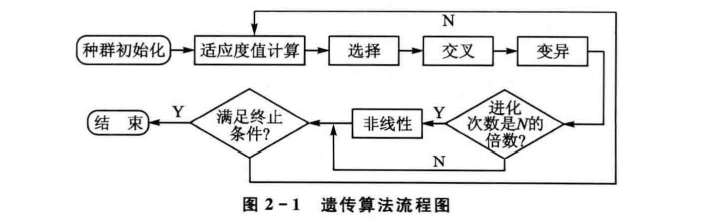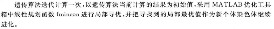 基本与遗传算法类似,种群初始化模块根据求解问题初始化种群,适应度值计算模块根据适应度函数计算种群中染色体的适应度值,选择、交叉和变异为遗传算法的搜索算子,N为固定值,当进化次数为N的倍数时,则采用非线性寻优的方法加快进化,非线性寻优利用当前染色体值采用函数fmincon寻找问题的局部最优值。