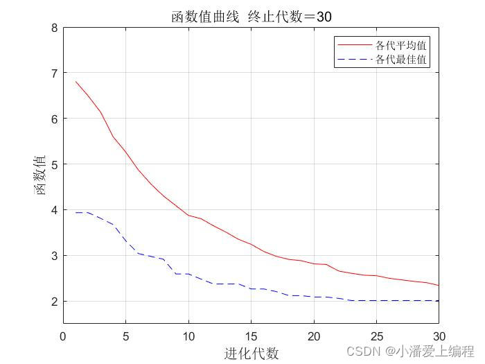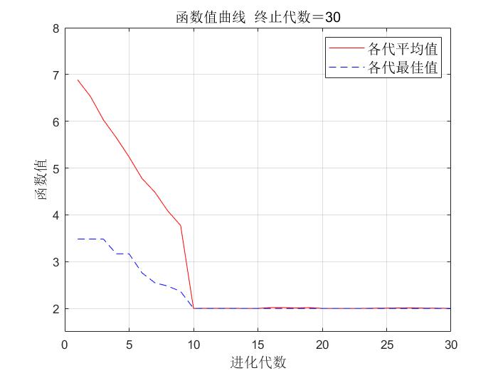 xlabel('进化代数','fontsize',12);ylabel('函数值','fontsize',12);