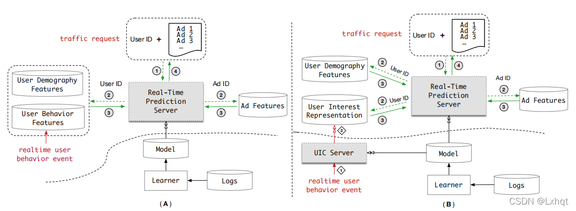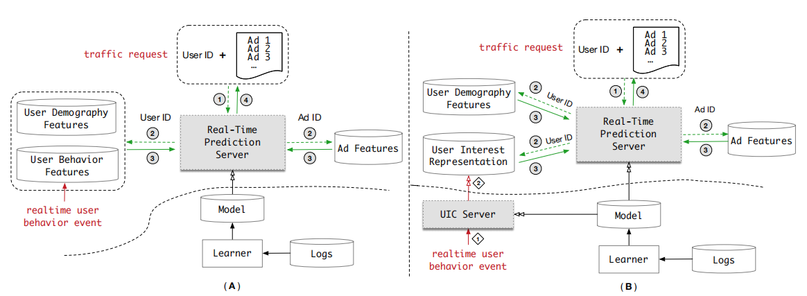 在本次介绍的一开始也提出了,在之前的模型中存在着存储和延时的问题,因此,在本论文中将用户的行为特征模块单独提取出来,分解成两个部分:用户兴趣表示以及UIC模块。(如下图所示)对于UIC是一个离线模块,在这个模块里无需流量请求,一直实时更新,并在这里将与用户的行为序列转变成用户的兴趣向量,然后传输给用户兴趣表示,这样实时预测系统提取的直接就是用户兴趣向量,减少了线上服务时间。简单的理解就是,预测系统所需要的是成品,而在原先的模型中我们在线上首先提取到的是材料,然后还要等待将材料变为成品的时间;但是对于新的模型是我系统直接拿到的就是成品,这样一来就减少了线上等待时间,就缓减了延迟。