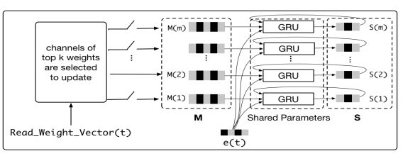 NTM一般使用来存储原始数据的,但是在这过程中会忽略了对高阶信息的捕捉,因此为了能更好的捕捉用户的兴趣,MIMN中就增加了记忆感应单元(MIU)来捕捉用户的兴趣演化过程。(如下图所示)。只有前K个权重才能进行更新,形成新的M矩阵,然后通过GRU形成新的兴趣矩阵向量。