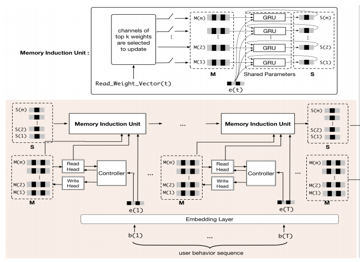 可以看到,在这个MIMN模型中主要就是由NTM(图灵机)和MIU(记忆感应单元)组成。它是借鉴NTM的思路,采用了memory-based model建模,在GRU时序模型的基础上引入external memory向量,显示存储行为信息。
