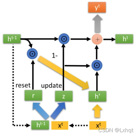 最重要的就是最后一个公式,正是因为它GRU才有了选择性记忆的一个功能。从公式上可以看到,分为两个部分,前面是将上一时刻有用的保留下来,后一部分是将此时刻所产生有用的保留。