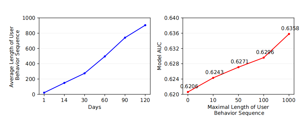 在论文中可以知道随着时间的增加,用户的行为序列也会呈现出暴增的形式,并且随着行为序列的增多,模型的AUC值增长了0.01(如下图所示),这在工业上有着很大的提升。