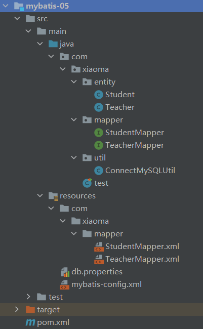 (2).项目目录图:entity存放实体类,mapper存放接口和局部配置文件(相当于dao层),util存放公共的工具类,test来测试效果用的,resources就不说了。