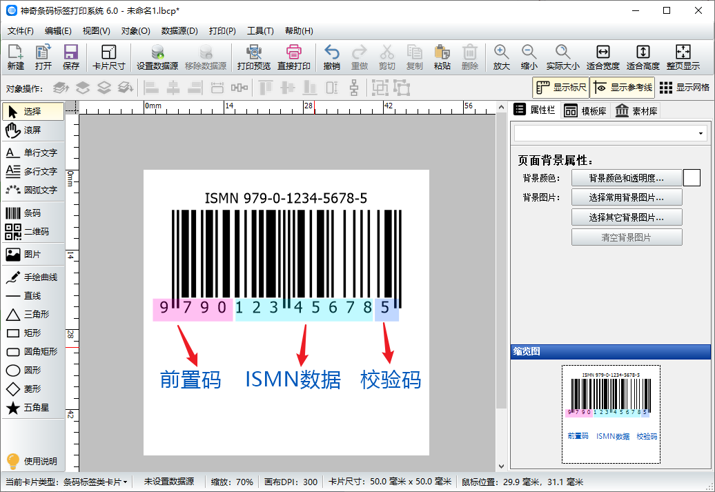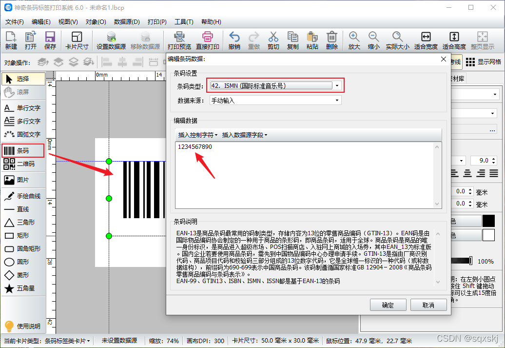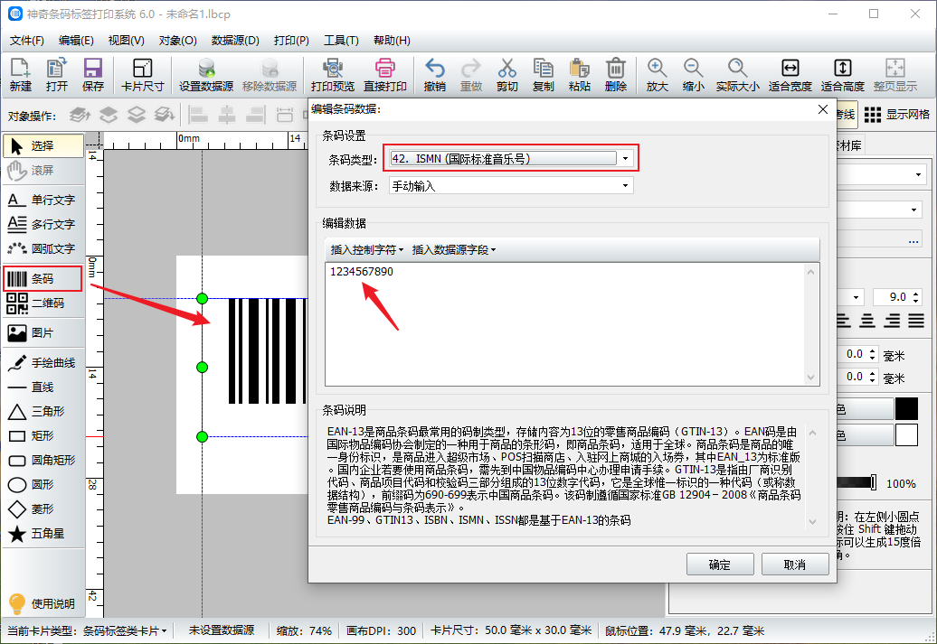 下面介绍如何在条码标签软件里制作ISMN码,点击软件左侧的“条码”按钮,在画布上绘制一个条形码,在弹出的编辑界面选择条码的类型为ISMN,输入条码的数据。