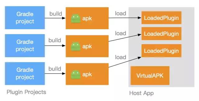 VirtualAPK对插件没有额外的约束,原生的apk即可作为插件。插件工程编译生成apk后,即可通过宿主App加载,每个插件apk被加载后,都会在宿主中创建一个单独的LoadedPlugin对象。如下图所示,通过这些LoadedPlugin对象,VirtualAPK就可以管理插件并赋予插件新的意义,使其可以像手机中安装过的App一样运行。