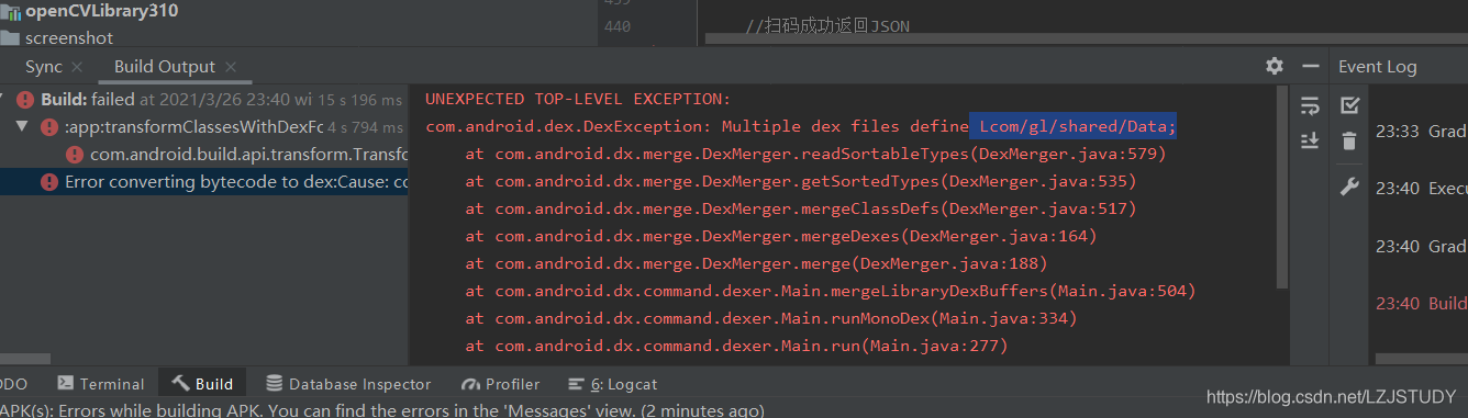 通过错误提示"Multiple dex files define L"后面的"xxx"检查自己的项目和依赖库中是否有同类型不同版本的jar包,如果确实是jar包冲突,找到这两个冲突的jar包之后删除其中一个,一般删除低版本的那个!