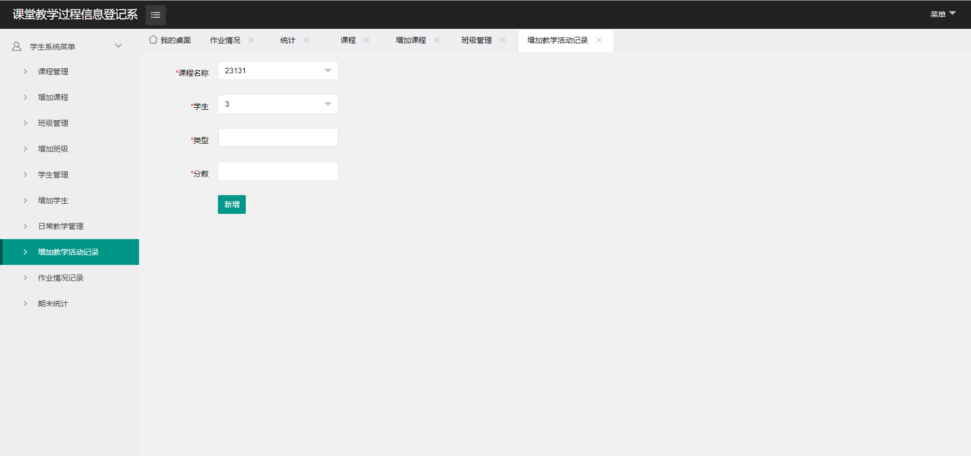 点进该课程下,可以新建将教学活动,在新增的教学活动中可以记录各学生的旷课、早退、迟到、以及其他违纪,也可以有加分项,每一个扣分,加分都以标签的形式记录到数据库