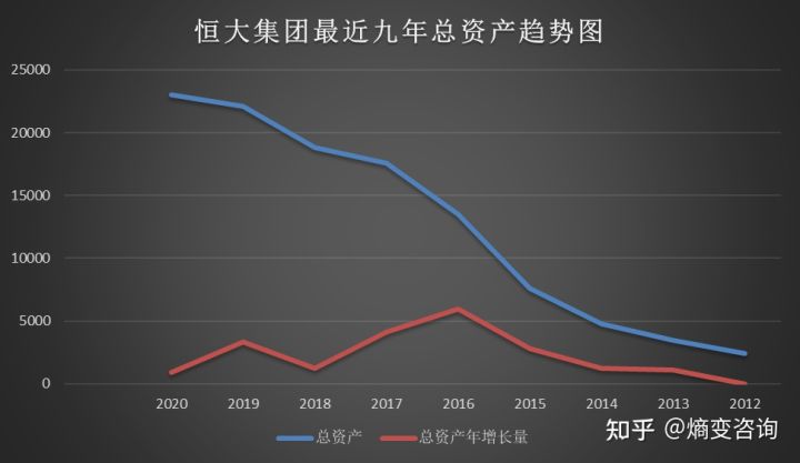 2、2012年以来,恒大累积融资超过8000亿,总资产增长了近十倍,从2389.91亿涨到2020年的23000亿,同时,负债也同步增长了近十倍,从1972.99亿增长到2020年的19500亿,企业经营现金流多年都是负值,更没有足够的风险对冲资本来降低负债,反而加剧了负债风险。