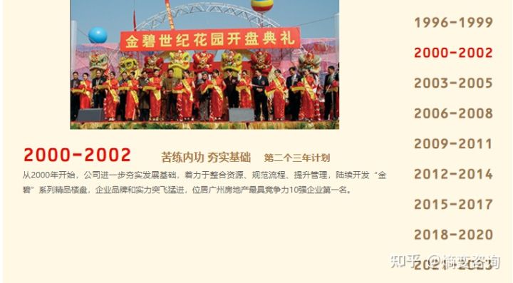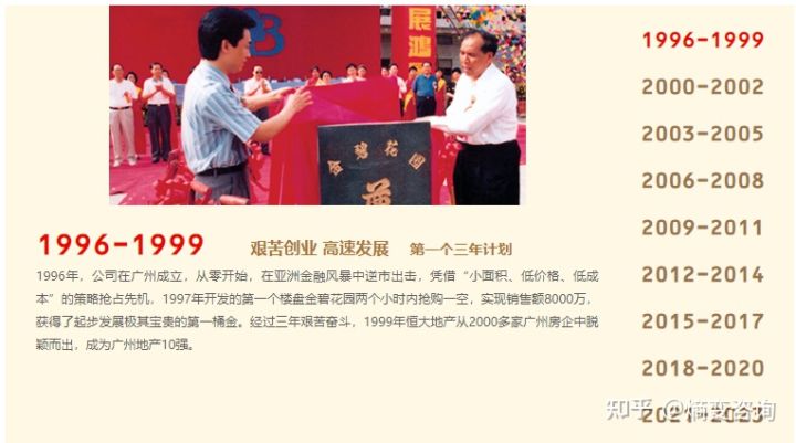 1996年,恒大在广州成立,从零开始,在亚洲金融风暴中逆市出击,凭借“小面积、低价格、低成本”的策略抢占先机,1997年开发的第一个楼盘金碧花园两个小时内抢购一空,实现销售额8000万,获得了起步发展极其宝贵的第一桶金。经过三年艰苦奋斗,1999年恒大地产从2000多家广州房企中脱颖而出,成为广州地产10强。