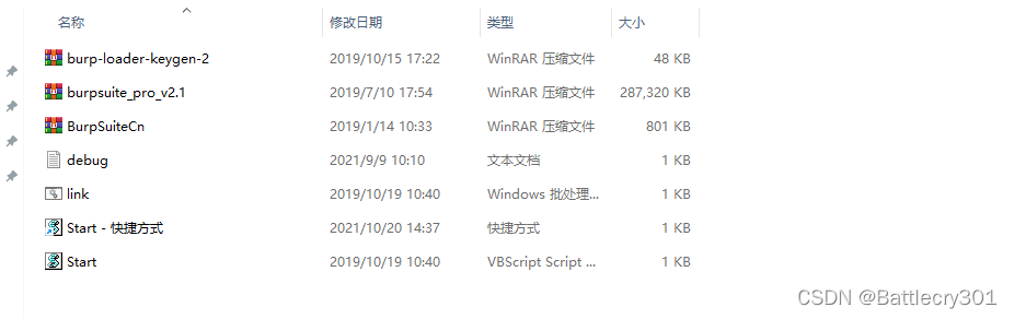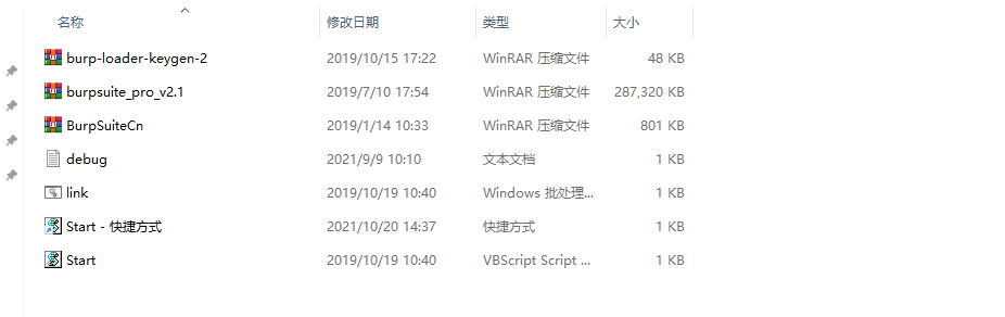 和教程不同的是这里的第一个burp-loader-keygen-2 是个压缩包,双击并不能打开,后缀也改不了,请教完大佬后发现这是电脑问题,就是电脑不能正确的识别,但是没关系不影响我们用另一种方法打开。
