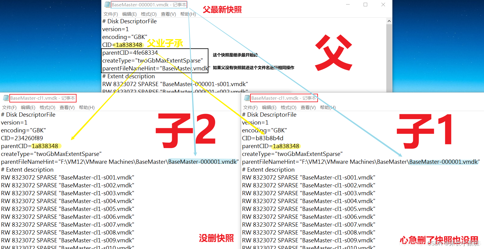 进入子的vmdk文档。替换 ①parentCID -> 父机的CID②parentFileNameHint -> 父机的vmdk路径;