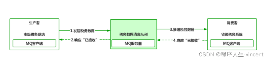 - 消息消费者 Consumer:指代使用数据的角色,前面案例的省级税务系统就是消息消费者;