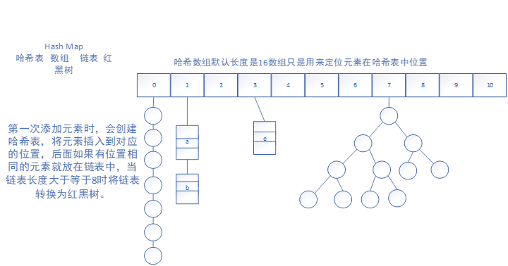 第一次添加元素时,会创建哈希表,将元素插入到对应的位置,后面如果有位置相同的元素就放在链表中,当链表长度大于等于8时将链表转换为红黑树。