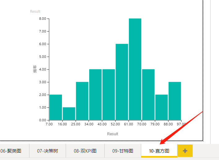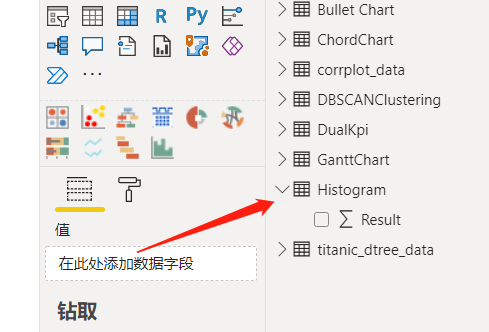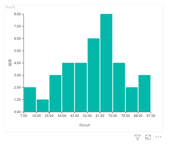6. 在“字段”窗格中勾选“Result”字段, 在Power BI画布中会显示设置后的直方图。