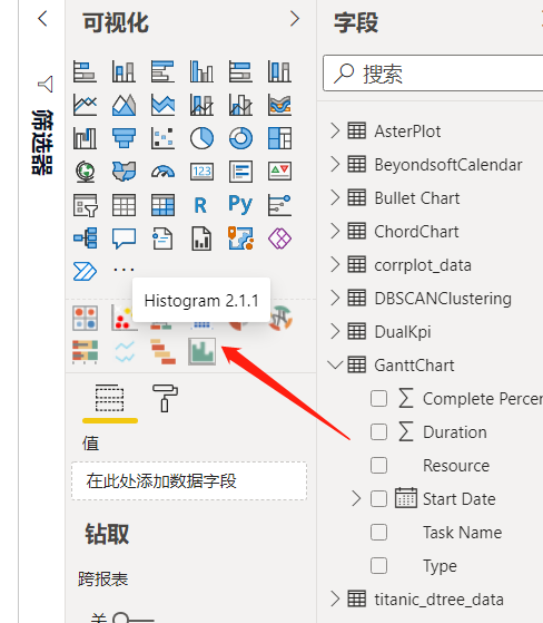5.单击“可视化”窗格中的“直方图”图标, 在画布区域会出现该图的模板, 由于没有填入数据, 因此图是灰色的。