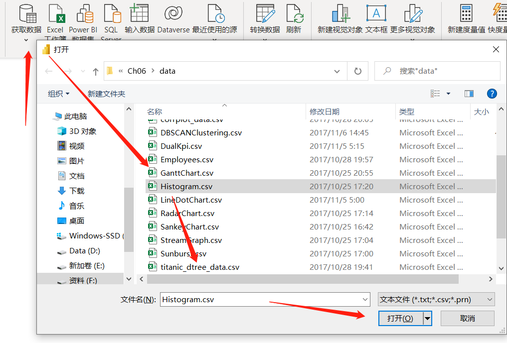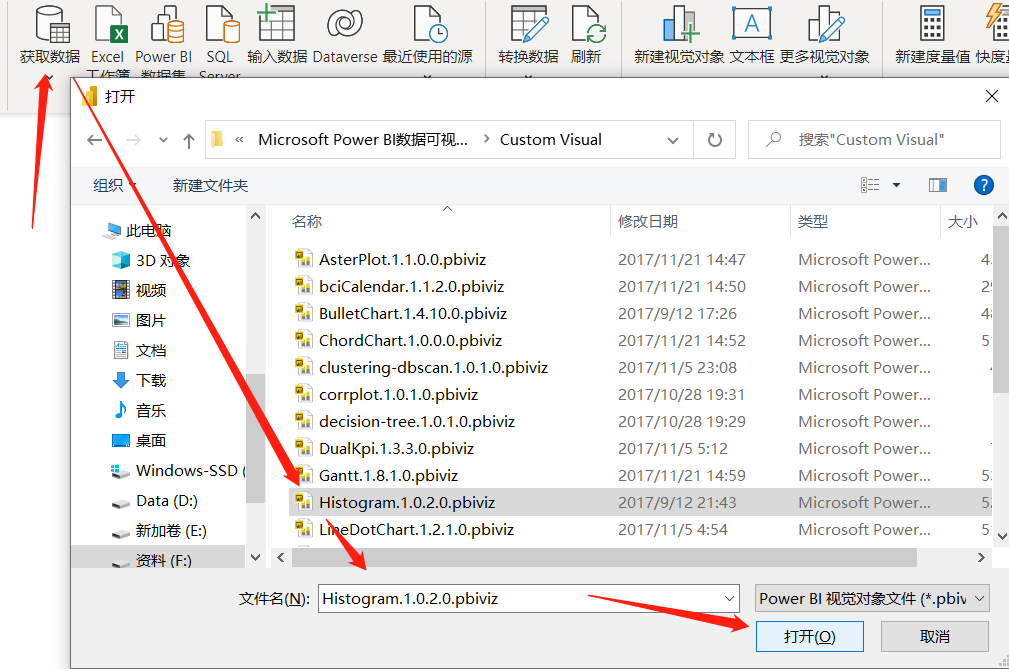 1.在Power BI中导入可视化效果, 点击… 选择导入自定义视觉对象,点击导入。