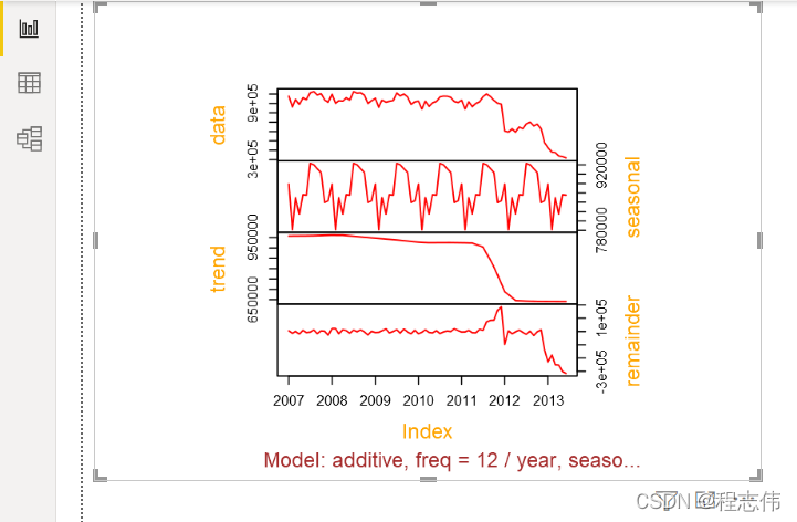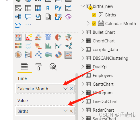 6. 在“字段”窗格中, 勾选“Births”和“Calendar Month”字段, 并将它们拖入“可视化”窗格相应的设置项中, 在Power BI画布中会显示设置后的时间序列图。