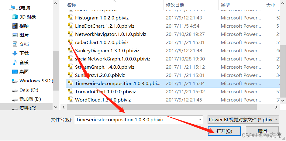 1.在Power BI中导入可视化效果, 点击… 选择导入自定义视觉对象,点击导入。