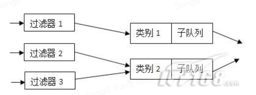 通常, 要实现功能强大的流量控制,可分类的队列是必不可少的。因此,类别(class)和过滤器(Filter)也是流量控制的另外两个重要的基本概念。图2所示的是一个可分类队列的例子。