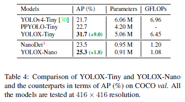 因为本文主要介绍的是轻量型模型,所以重点关注轻量的模型Nano和tiny版本,nano版本在0.91M参数量的情况下,416尺度推理精度达到了25.8,还是非常不错的;再看tiny版本,tiny版本一直是yolo系列中的一个特色,所以yolox也继续发扬了这一项工作,在参数量减少的情况下,大幅提高了tiny版本的精度,达到了32.8,要知道18年yolov3刚出来的时候,最高的精度也才33,现在tiny版本的精度已经赶上v3正版了,不得不感叹这两年的目标检测技术发展的迅猛,隐约有种被卷死的不详预感,所以各种同学一定要坚持学习啊,千万不要懈怠了。