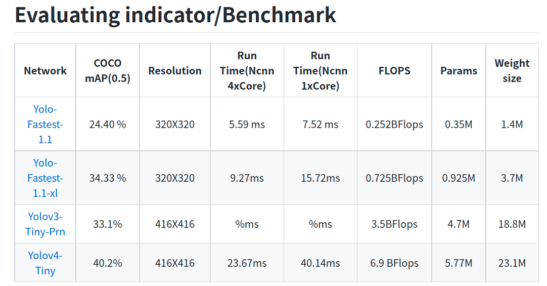 yolo-fastest应该是第一个把yolo系列参数量逼到1M以内的目标检测算法,由记得刚出来的时候非常的震惊,模型大小仅为1.3M,让我第一次直观的感受到原来目标检测算法也可以设计得这么小。感兴趣的可以看上面两篇文章介绍,目前已经更新到V2版本,精度指标如下: