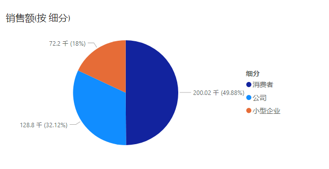 10.在“字段”窗格中, 将“细分”字段拖动到画布右下角的空白处, 然后将“订单ID”字段拖动到“可视化”窗格下半部分的“值”设置项中, 再选择“饼图”可视化效果。
