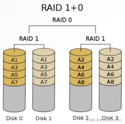 ①N(偶数,N>=4)块盘两两镜像后,再组合成一个RAID 0。