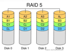 ①N(N>=3)块盘组成阵列,一份数据产生N-1个条带,同时还有1份校验数据,共N份数据在N块盘上循环均衡存储。