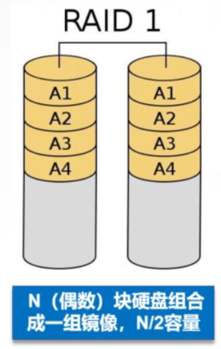 | RAID1 | N(偶数) | N/2 | 有 | 允许一个设备故障 | 需写两对存储设备,互为主备 |