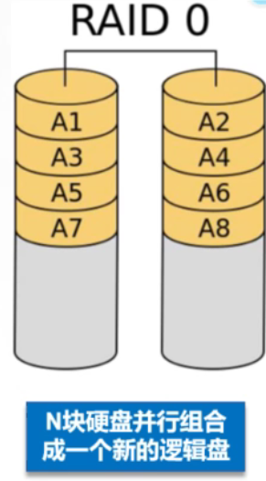 ②RAID 0只是单纯地提高性能,并没有为数据的可靠性提供保证,而且其中的一个磁盘失效将影响到所有数据。
