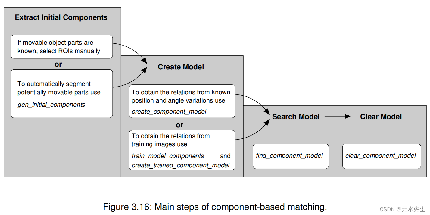 定位可以相对移动的组件的任务比 基于形状的匹配所需的过程更长。例如,不是单个 ROI,而是多个 ROI (包含初始组件)必须被选择或提取。此外,关系,即 必须确定模型组件之间可能的移动。概览,图 3.16 说明了基于组件的匹配所需的主要步骤。