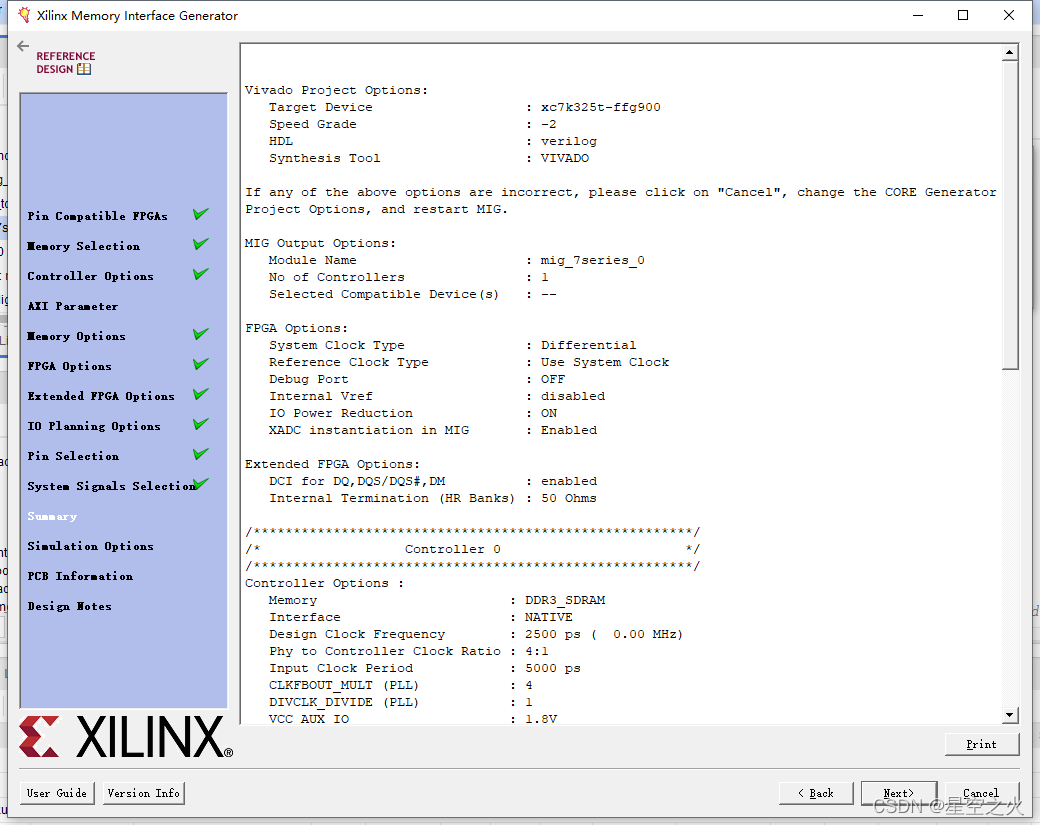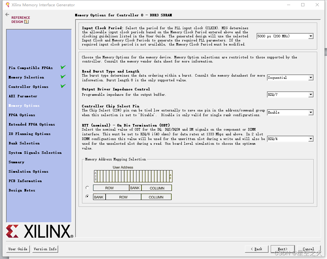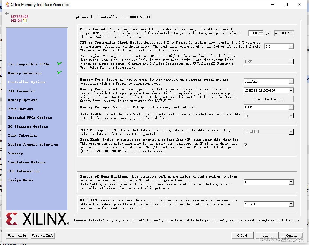 下面的PHY to Controller Clock Ratie 4:1 ,表示用户时钟是400M/4=100M,这个用户时钟,是IP核自动生成的(ui_clk)。后期的用户接口写数据和读数据都是按照这个时钟去操作。