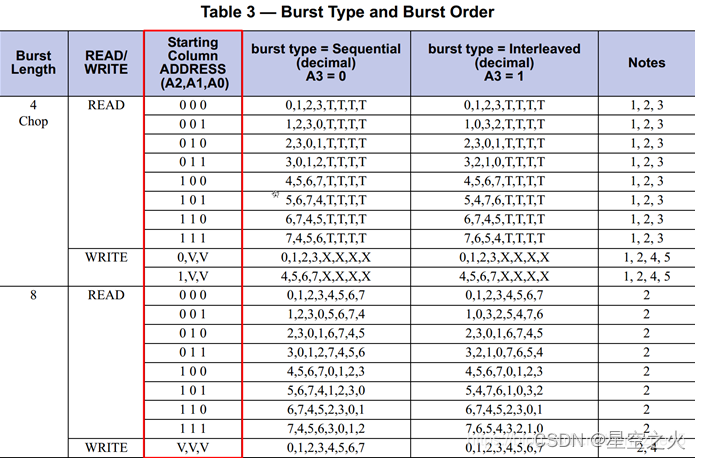 我们可以看一下这个DDR3的内部结构图,从这个图中我们可以看出10bit的Column Address的寻址能力只有128,只有7bits用于列地址译码!列地址0,1,2并没有用,而这列地址的低三位被用于确定Burst Length 与Burst Order了.见下图: