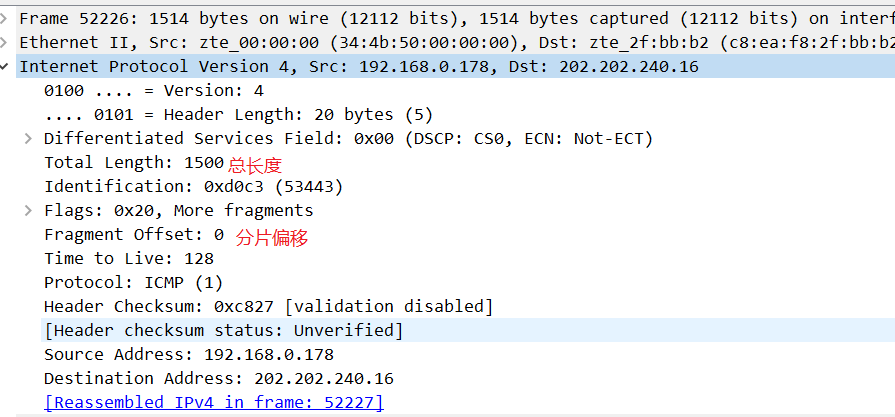 缺省的,ping 命令只会向对方发送 32 个字节的数据。我们可以使用 ping 202.202.240.16 -l 2000 命令指定要发送的数据长度。此时使用 Wireshark 抓包(用 ip.addr == 202.202.240.16 进行过滤),了解 IP 包如何进行分段,如:分段标志、偏移量以及每个包的大小等