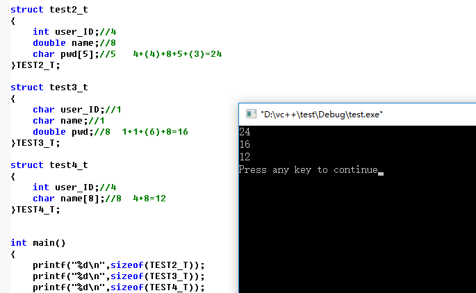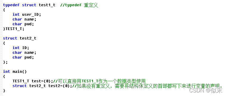 结构体声明:struct+结构体名(自己命名)+{ 不同类型数据项 };如果在声明的时候将变量名放在分号前面如(struct user{ int id; char name[10] }test;),此时的test为全局变量。