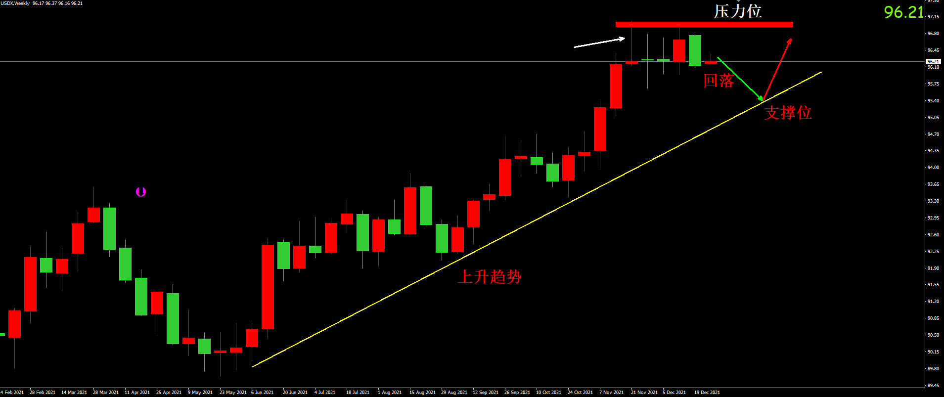 美元指数:图表显示目前美指为震荡反弹行情。关注压力97.00位置。