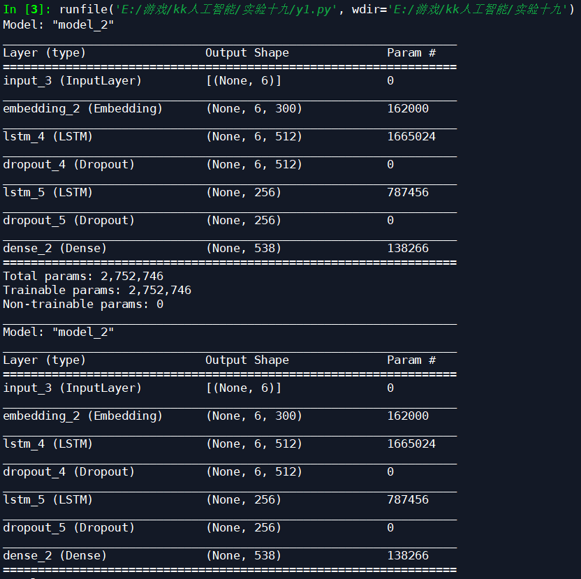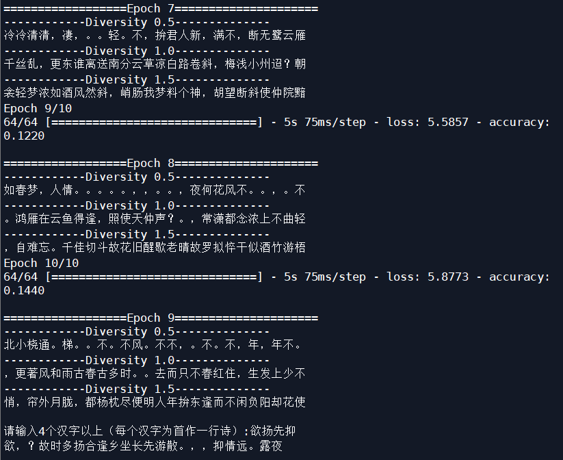利用如下代码和100首经典宋词的数据,基于LSTM生成新的词,并调整网络参数,提高生成的效果。